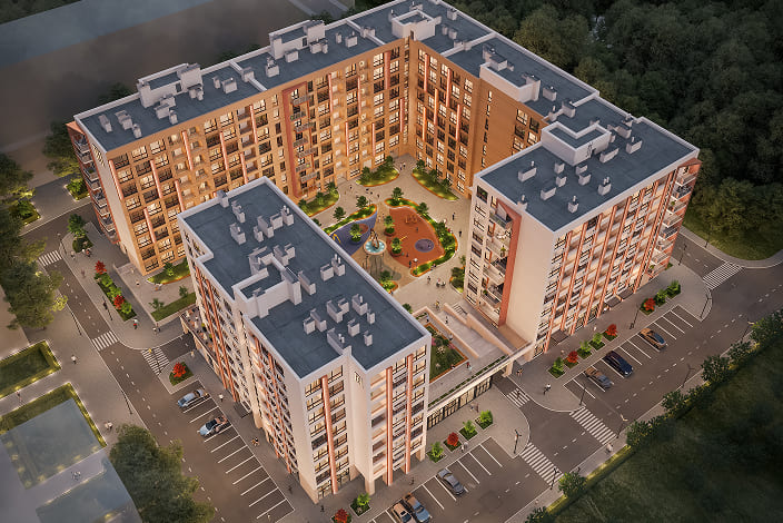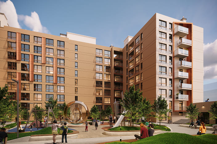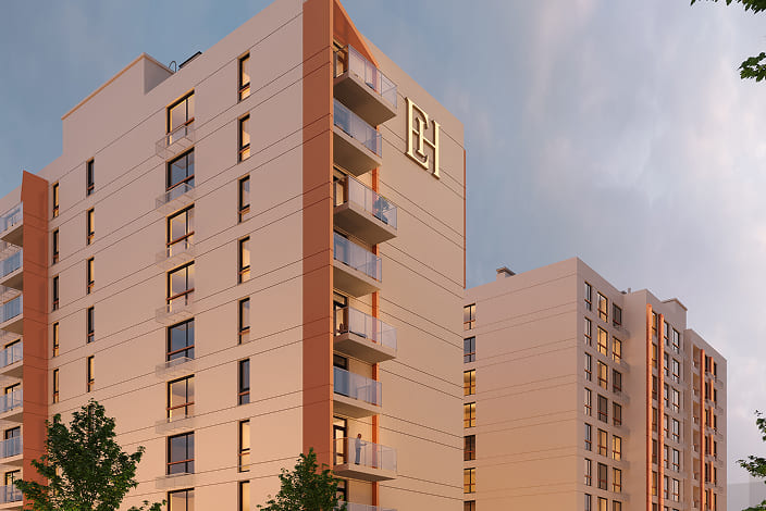 3 будинки по 9 поверхів, стильні фасади, підземний паркінг, зручні планування для життя та бізнесу.